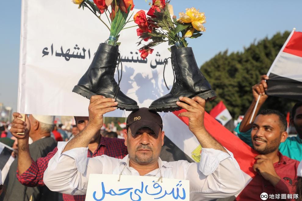 在首都開羅的街頭,一名男子把插著花束的軍靴高舉過頭,力挺埃及現任總統、軍人出身的塞西(Abdel Fattah Al Sisi)。近日,開羅街頭出現大批反政府民眾上街遊行,他們要求家族涉貪的塞西總統下台,隨後這些異議人士遭到武力鎮壓,引發國際社會關注。