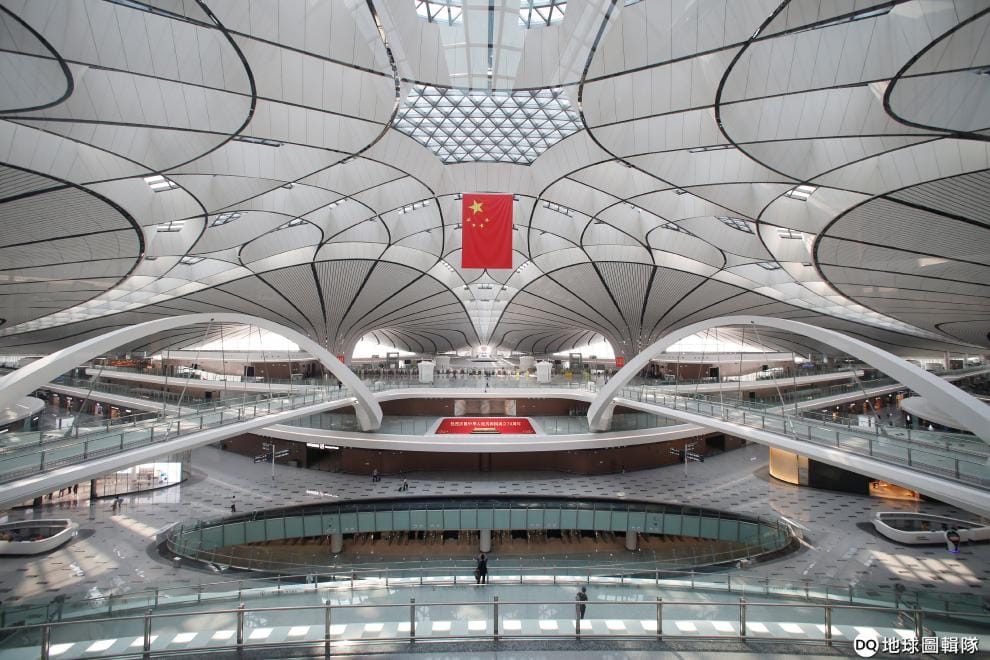 畫面中是剛剛開張的「全球最大機場」北京大興機場。這座機場的外觀就像大大的六爪海星,建築內則處處可見充滿現代感的曲線結構。