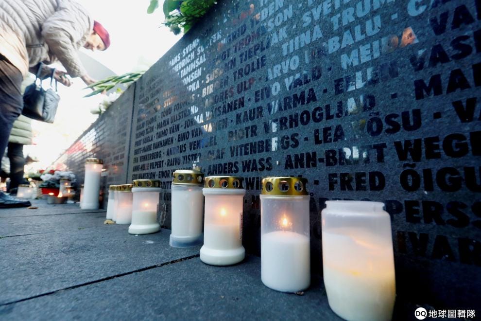 人們在紀念碑前點起蠟燭,悼念在 1994年9月28日那天,愛沙尼亞號(MS Estonia)在波羅的海沉沒的悲劇,該事件造成船上 803名乘客、186名船員全數身亡,是歐洲自第二次世界大戰後最嚴重的海難事件。