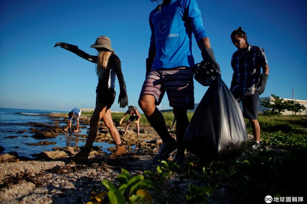 在首都哈瓦那(Havana)的海灘,一群志工正在此清理沙灘上的垃圾。