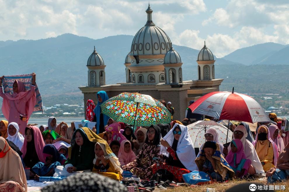 人們聚集在因為地震損毀的清真寺旁祈禱,悼念在一年前,印尼蘇拉威西島(Sulawesi)帕盧市(Palu)遭逢規模 7.5淺層強震與地震引起的海嘯,造成至少 2,037人死亡的悲劇。