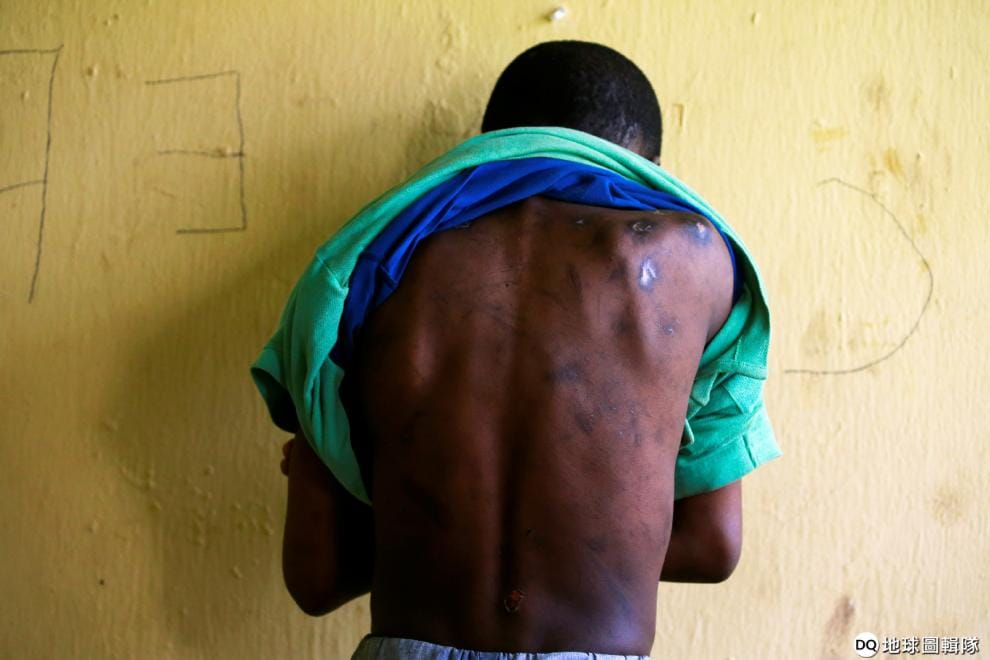 在臨時安置所內,一名孩童向《路透社》攝影記者展示了自己背後的傷痕。