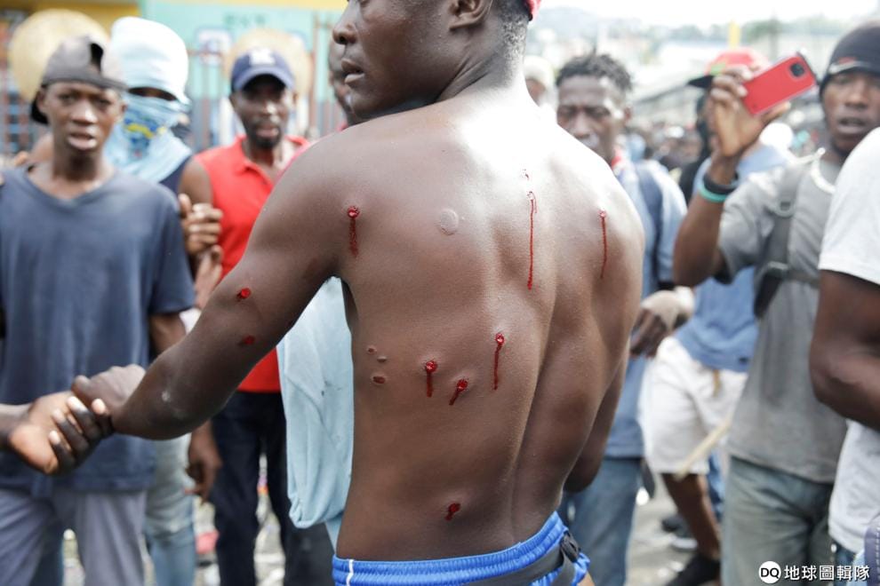 一名男子向其他人展示自己在示威過程中受傷的背部。這幾天,許多示威者走上首都太子港的街頭抗議政府貪腐,也要求海地總統摩依士(Jovenel Moise)下台以示負責。