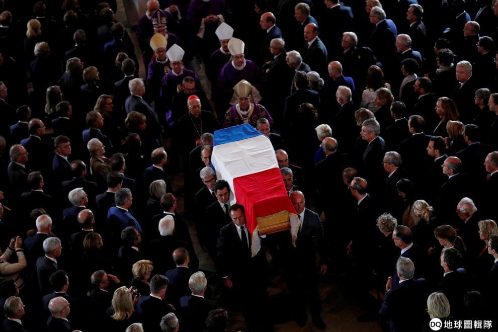 人們扛著法國前總統席哈克(Jacques Chirac)的棺木,準備將席哈克葬在聖敘爾比斯教堂(Saint Sulpice)。