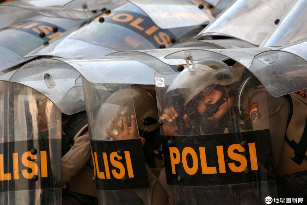 鎮暴警察站在印尼國會建築外,警戒著來此示威的民眾。