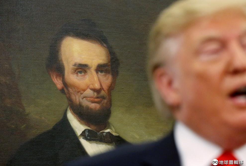 在美國勞動部長斯卡利亞(Eugene Scalia)於白宮的就職宣誓典禮上,美國前總統林肯(Abraham Lincoln)的畫像與美國總統川普(Donald Trump)相映成趣。