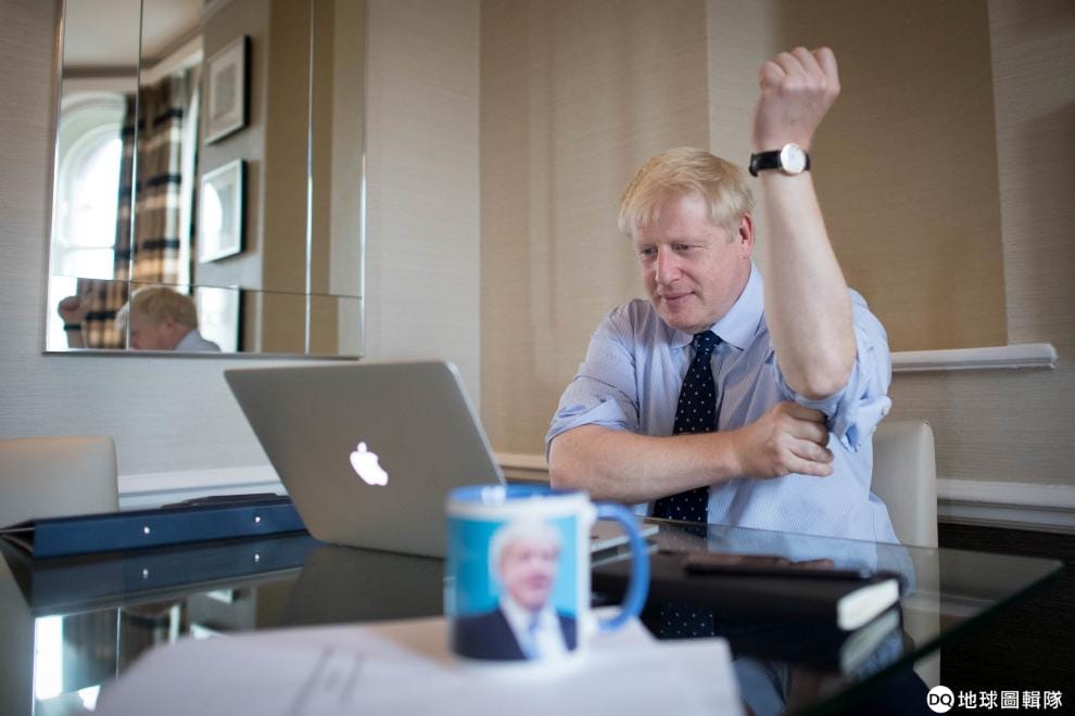 英國首相強生(Boris Johnson)打開筆電,為隔天在保守黨會議上的演說簡報作準備。畫面一旁是印有強生照片的馬克杯。