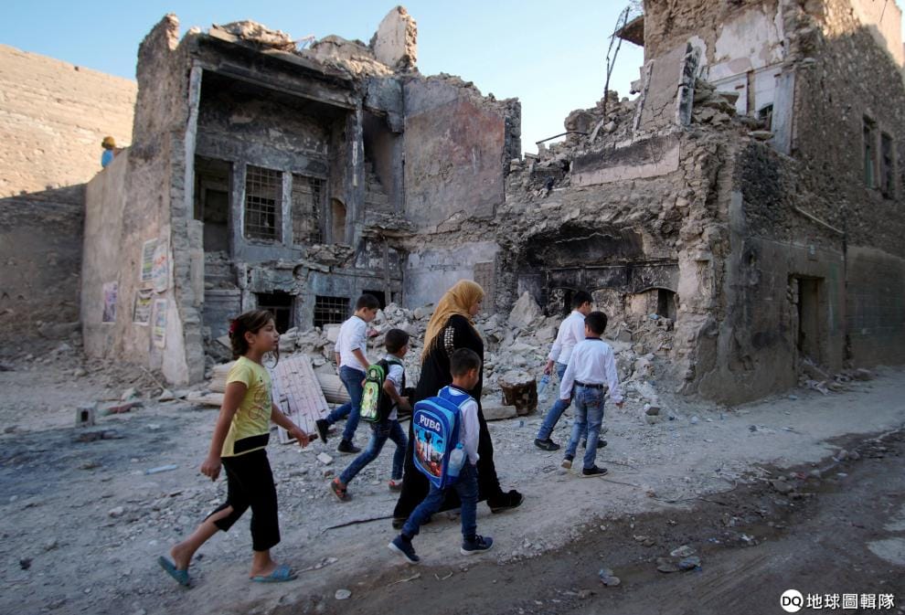 在摩蘇爾城(Mosul)舊城區,面對新學期來臨,一名女子帶著孩子們走在上學路上。