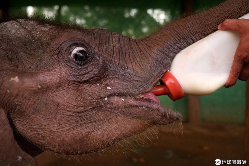 在城市勃固(Bago)的大象照顧營Wingabaw,4個月大的小象辛恩(Ayeyar Sein)正在接受照護。牠因為盜獵者的關係失去了父母。