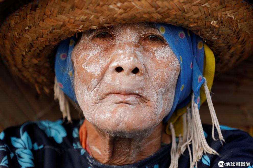 在馬塔普拉河上,一名女子坐在木船上販售蔬果,並在臉上塗滿傳統上用來降溫的粉末。