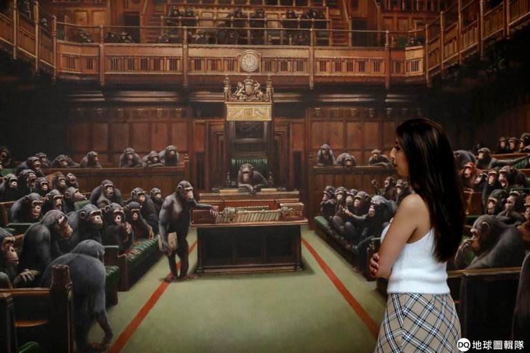 除了開了一家「噁心傢飾」店,今天班克斯的作品《下放國會》(Devolved Parliament)將在英國蘇富比(Sotheby)拍賣場上供人競標,預計可以 150萬到 200萬英鎊(折台幣約 5,868-7,824萬元)之間賣出。這幅畫描繪了英國國會開會的模樣,只不過國會中出現的議員全部被換成了猩猩。
