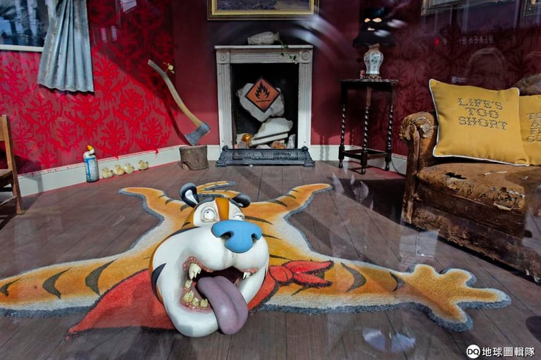 在地上,則有一塊家樂氏(Kellogg)玉米片吉祥物老虎Tony the Tiger的虎皮毯,其中老虎的牙齒已經因為含糖量高的玉米片蛀光光了。