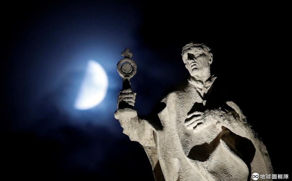 在雲霧之間的月亮,與屹立在聖彼得廣場(Saint Peter's Square)的雕像相互輝映。這裡剛結束宗教典禮。