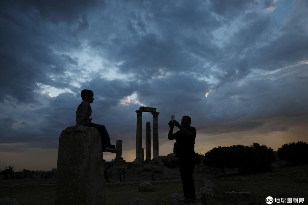 來到座落於安曼市中心的安曼城堡(Amman Citadel),一名遊客正在幫兒子和大力士廟(Temple of Hercules)的柱子合照。