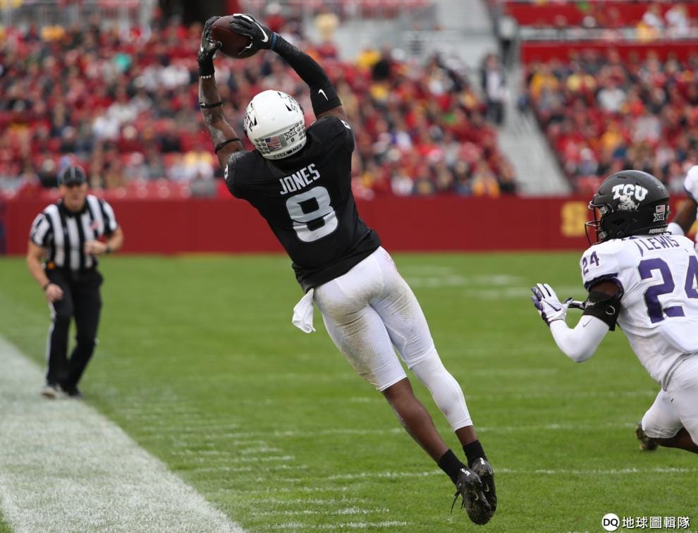 在美式足球賽場上,一名外接員起身接住球員傳來的球,漂亮的瞬間被攝影師給捕捉了下來。
