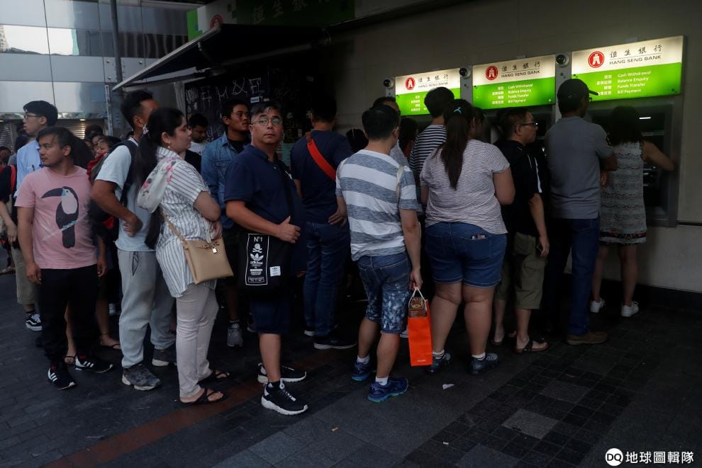 在尖沙咀某處的恆生銀行提款機前,只見大排長龍的人們想趕快把錢領出來。