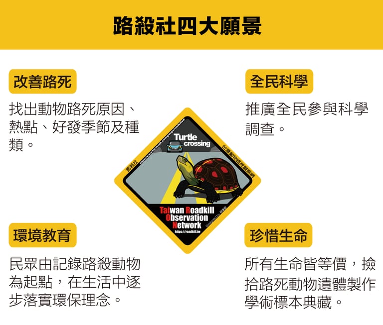 雲林古坑綠色隧道的幾個路段有明顯的陸龜路殺問題,路殺社積極介入協助。其他合作單位還有北橫、東北角、高雄、屏東林管處,花蓮台九線拓寬計畫,也把路殺社資料納入考量。