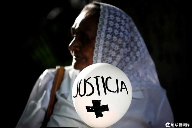 一名女子拿著寫有「正義」字樣的氣球,對當局針對薩爾瓦多內戰罪犯發布的赦免令表達不滿。
