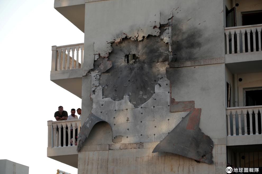 在城市努賽賓(Nusaybin),人們張望著被飛彈擊中損毀的大樓。