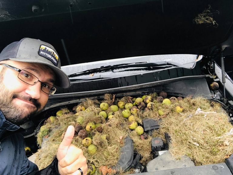 克里斯和荷莉推測,應該是他們將車子停在室外的時候,被住在附近的松鼠相中,成了儲存過冬食物的倉庫。他們於匹茲堡的住家後院種了一棵核桃樹,前幾周才開始掉落成熟的核桃。