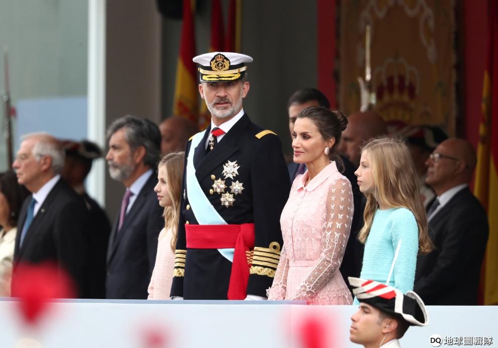 在西班牙國慶日上,西班牙國王菲利普六世(King Felipe VI)、西班牙王后萊蒂西亞(Queen Letizia)和萊昂諾爾公主(Princess Leonor)、蘇菲亞公主(Princess Sofía)一起參加慶祝典禮。