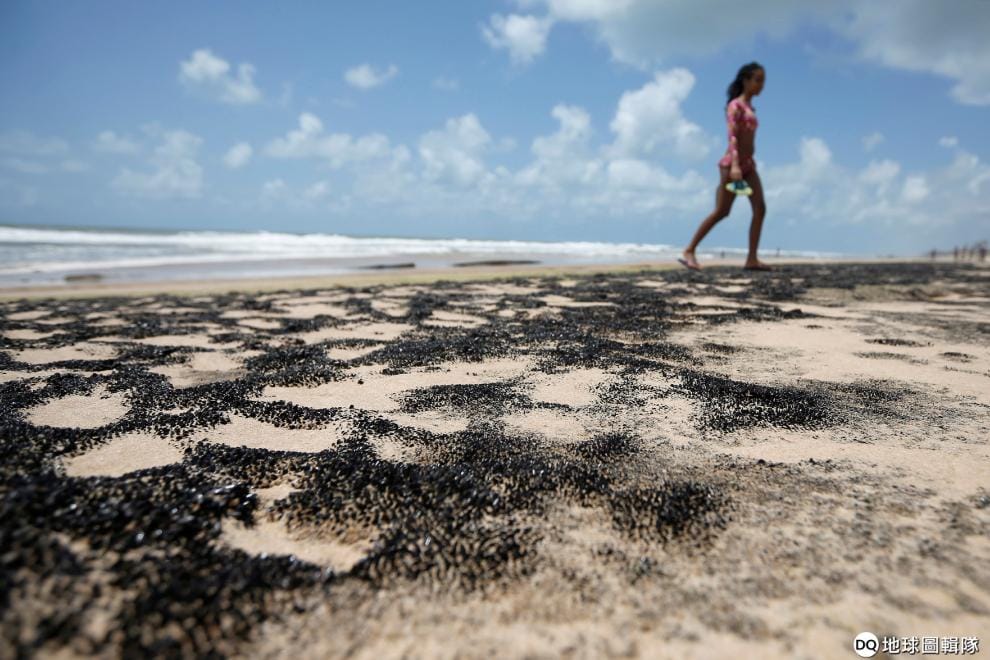 在巴伊亞州的孔迪海灘(Conde Beach)上,一名女子經過被漏油汙染的海灘。近日,巴西東北部海岸出現神秘漏油事故,嚴重汙染東北部海域,當局認為可能和外國犯罪活動有關,目前尚在調查中。