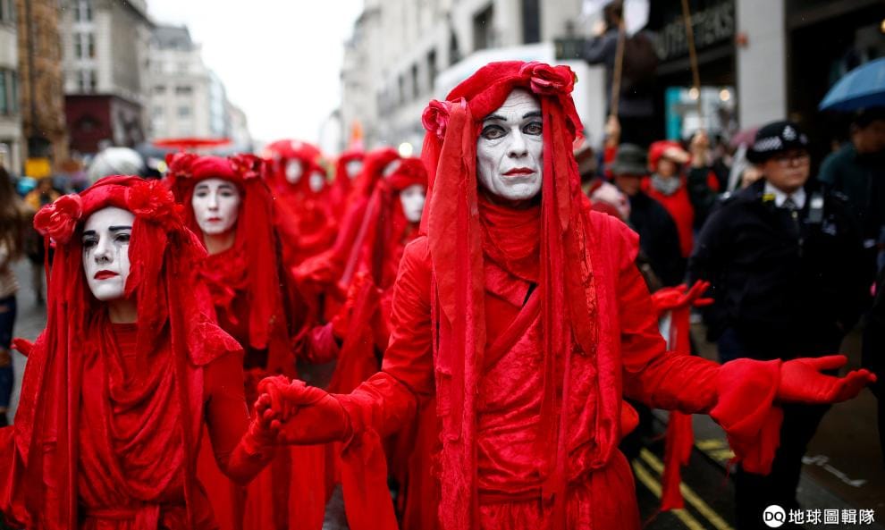 在環境與氣候保護示威組織「滅絕反叛」(Extinction Rebellion)舉行的倫敦遊行上,一群示威民眾穿上紅衣、畫上白臉妝呼籲大眾重視氣候變遷。