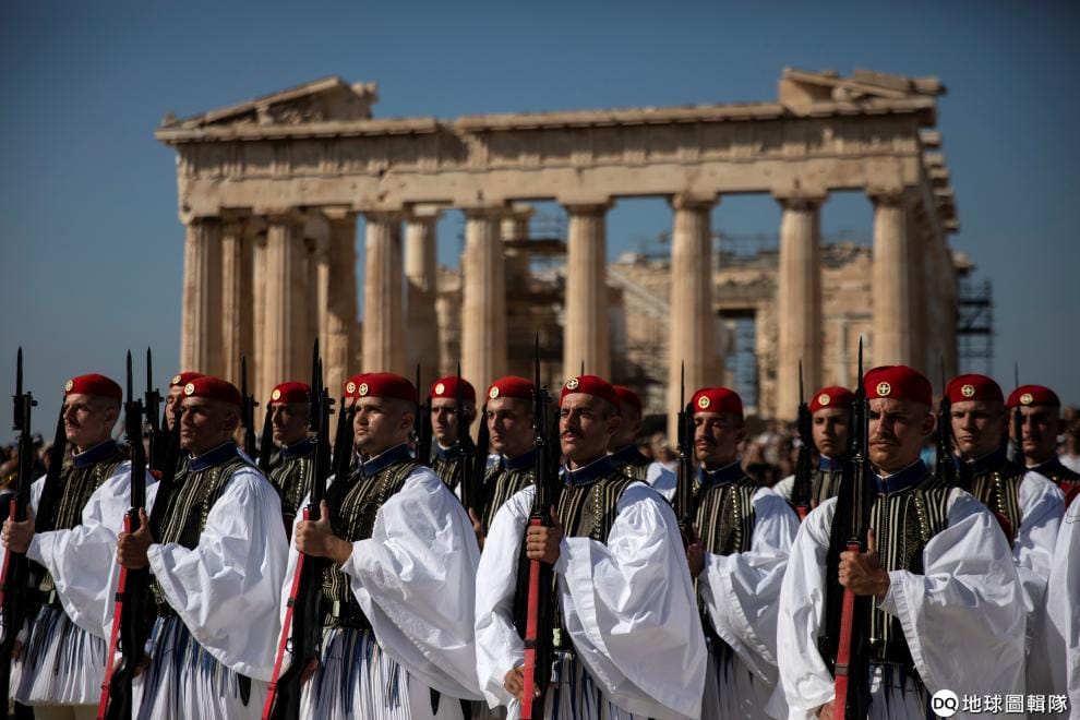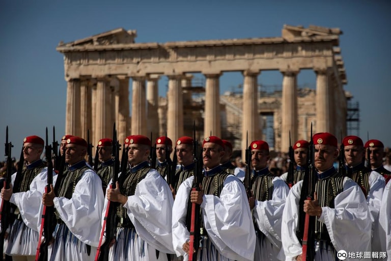 在雅典衛城的帕德嫩神廟前,總統衛隊埃夫佐尼(Evzones)整齊劃一地紀念雅典從納粹佔領中解放滿 75周年。