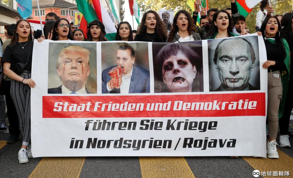 在蘇黎世街頭,聲援庫德族的民眾拉起示威布條抗議美方撤兵,由左至右分別是美國總統川普(Donald Trump)、土耳其總統埃爾多安(Tayyip Erdogan)、德國總理梅克爾(Angela Merkel)、俄國總統普亭(Vladimir Putin),布條底下寫到「與和平和民主背道而馳,他們在敘利亞北部開戰」。