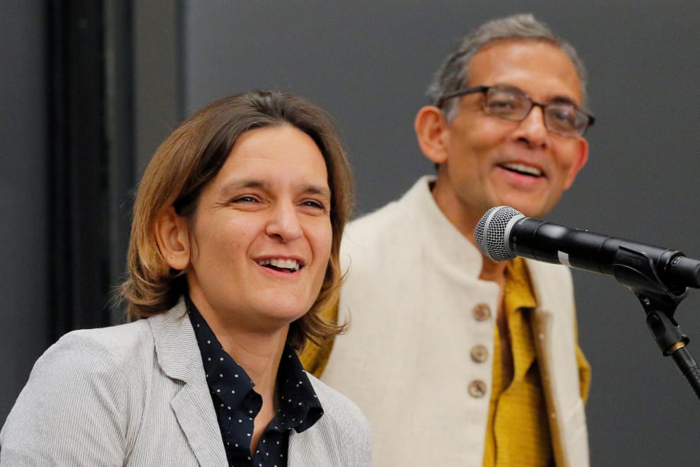 在麻省理工學院舉辦的記者會上,教授夫妻檔巴納吉(Abhijit Vinayak Banerjee)和杜芙洛(Esther Duflo)開心接受眾人的喝采,他們和哈佛大學教授克里莫(Michael Kremer)一起以對抗貧窮的研究,榮獲了今年的諾貝爾經濟學獎。