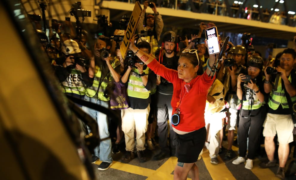 在大批媒體的注視下,一名反政府的示威民眾手舉寫著「愛」的牌子,一步步走向鎮暴警察,對香港政府援引《緊急法》讓《禁蒙面法》上路表達不滿。