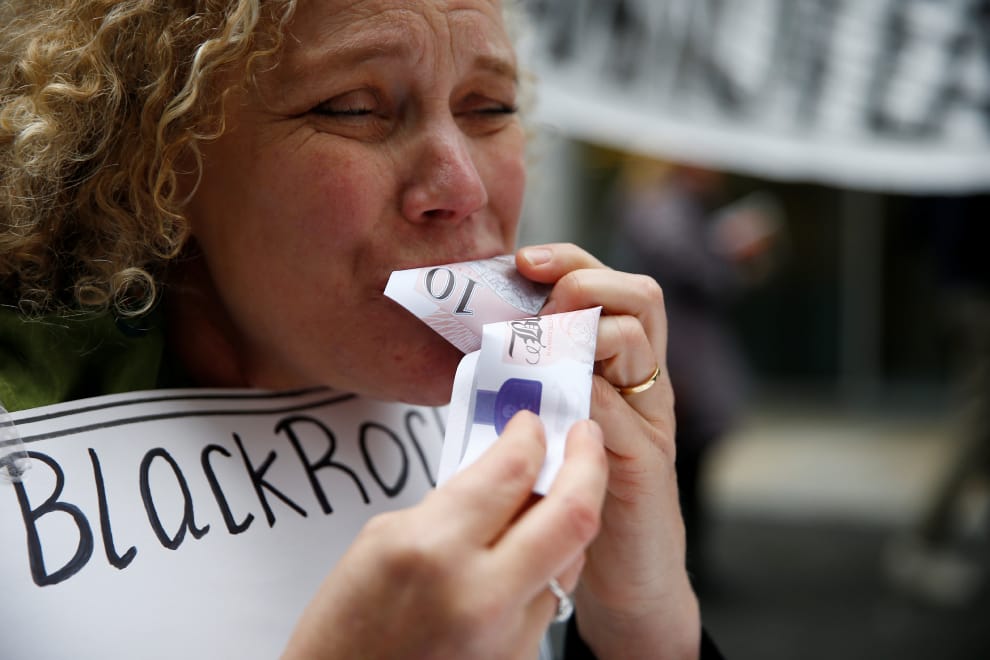 在倫敦金融城的美國投資管理公司貝萊德(BlackRock)辦公室外,參與環保組織「滅絕反叛」(Extinction Rebellion)抗議行動的民眾,將一張張英鎊假鈔塞入口中,諷刺貝萊德為了賺錢,支持破壞雨林,對環境造成嚴重破壞。
