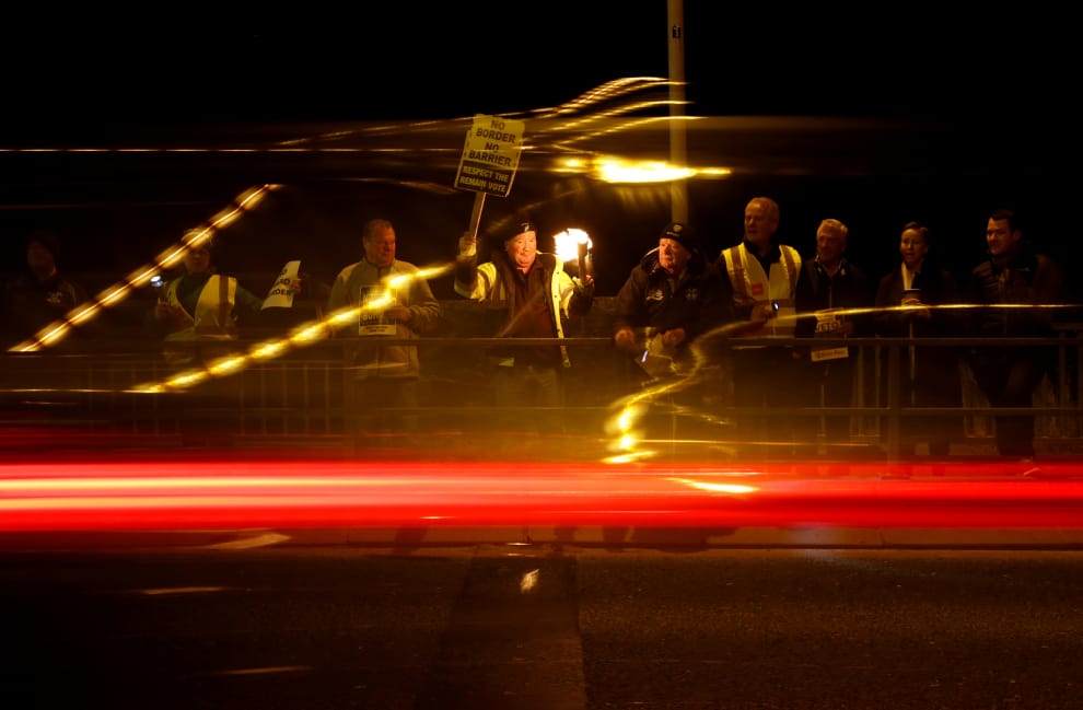 在北愛爾蘭的德理郡(Derry county)和愛爾蘭的多尼戈爾郡(Donegal county)之間,抗議脫歐的民眾正在參加守夜活動,他們手舉寫有「沒有邊界,就沒有障礙 請尊重留歐投票」字樣的牌子,表達對愛爾蘭邊界問題的擔憂。與北愛爾蘭地區接壤的愛爾蘭是獨立的歐盟國家,待北愛爾蘭地區與英國脫歐後,兩地區之間的邊界將成為英國與歐盟唯一的陸路邊界。