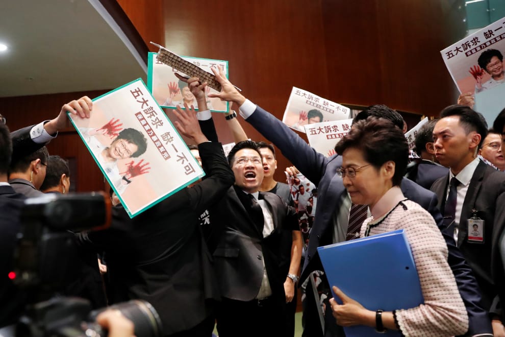 16號這天,香港特首林鄭月娥抵達立法會,準備宣讀施政報告。與此同時,泛民主派議員手舉寫有「五大訴求,缺一不可 保皇黨乃暴政幫兇」字樣的海報抗議。在宣讀施政報告的過程中,香港特首林鄭月娥因泛民主派議員在場內示威,二度遭打斷後由立法會主席梁君彥宣布休會,隨後離開現場。