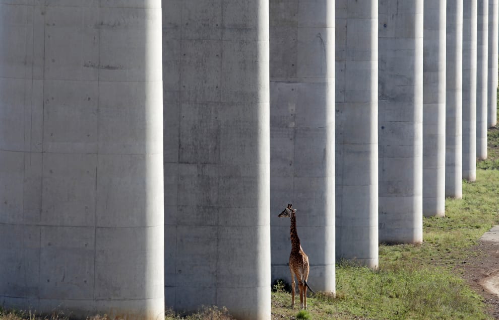 在奈洛比國家公園內,一隻長頸鹿徘徊在架高的標準火車鐵軌下,這條鐵軌的兩端分別是奈洛比和奈瓦沙鎮(Naivasha),之所以架高是為了讓動物們可以從底下通過。