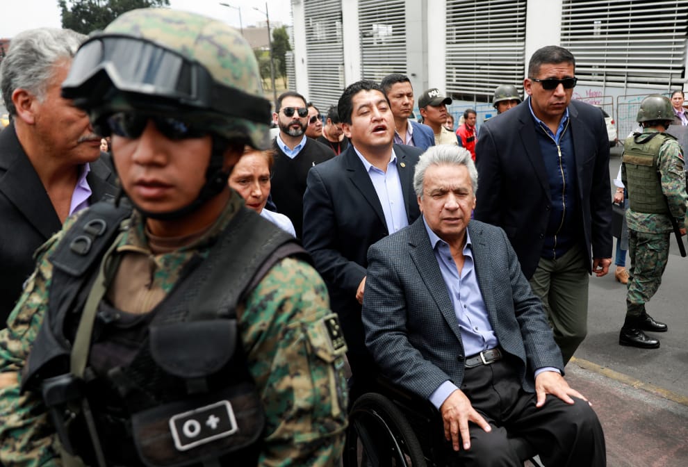 在首都基多(Quito),維安人員推著厄瓜多總統莫雷諾(Lenin Moreno)視察被示威民眾破壞的街道。近日,不滿莫雷諾取消了 40多年的燃料補助的民眾發起示威行動。在歷時兩周的抗議與暴力衝突後,厄瓜多政府已經同意暫緩撙節政策,街頭示威的緊繃氛圍也逐漸趨緩。