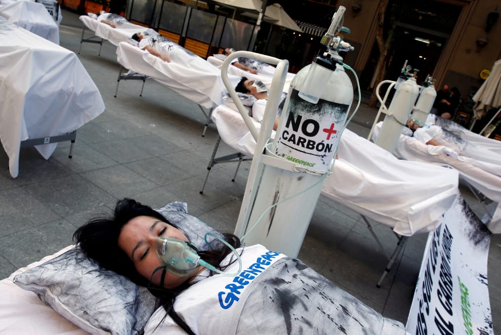 在首都聖地亞哥,綠色和平組織的成員躺在一張張病床上,抗議國際社會對氣候變遷的漠不關心。當地即將在 12月2日到 13日舉行 2019年聯合國氣候變化大會(COP25)。