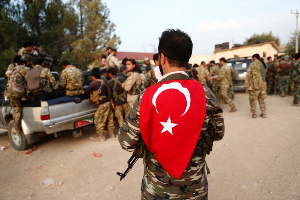 在鄰近敘利亞邊界的土耳其小鎮阿克恰卡萊(Akcakale),受到土耳其支持的敘利亞軍人全副武裝、帶著土耳其國旗準備進入敘利亞掃蕩庫德族勢力。