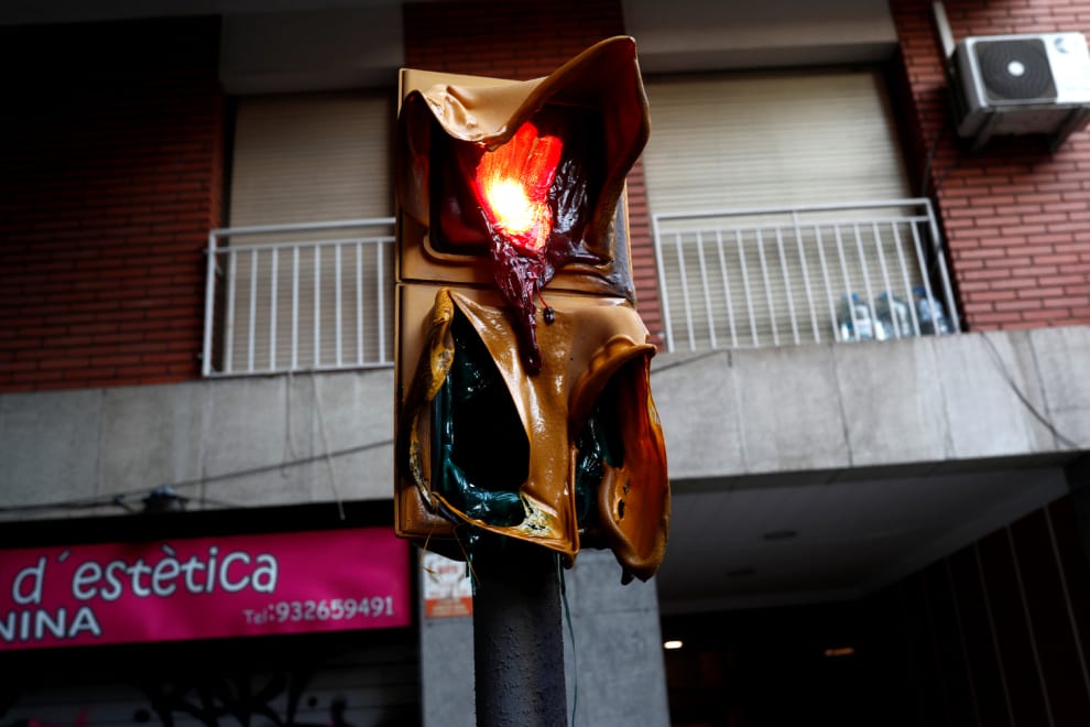 在加泰隆尼亞自治區的巴塞隆納,街頭的紅綠燈被抗議民眾放的大火給融化,他們不滿西班牙最高法庭針對加獨人士的判決。