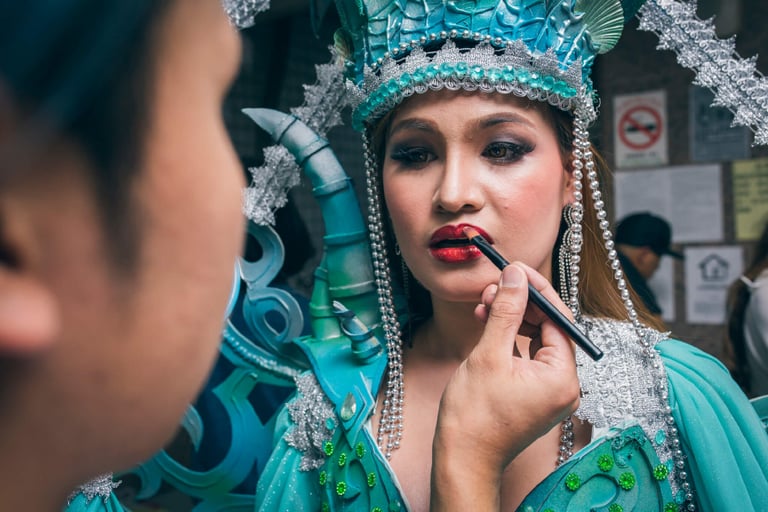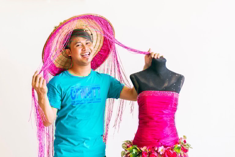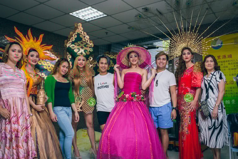 他與團隊們要參加一場在台灣的菲律賓選美比賽,參賽條件是利用回收物製作禮服。高中就接觸藝術的他對於禮服的呈現頗有想法,也做過類似的事情,因此從畫草圖、找材料、縫製禮服到化妝,他都能一手包辦。他還記得,他在那次的比賽裡一口氣製作了四套禮服,得到很好的評價。從此,只要同鄉們找他幫忙,若時間可以配合他都會趕到,不管是台北、台中還是高雄。