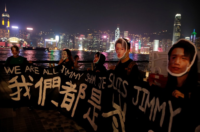 襯著香港夜景,反政府示威民眾戴上民間人權陣線召集人岑子杰的面具,手持寫有「我們都是岑子杰」字樣的布條,抗議岑子杰遭襲事件。