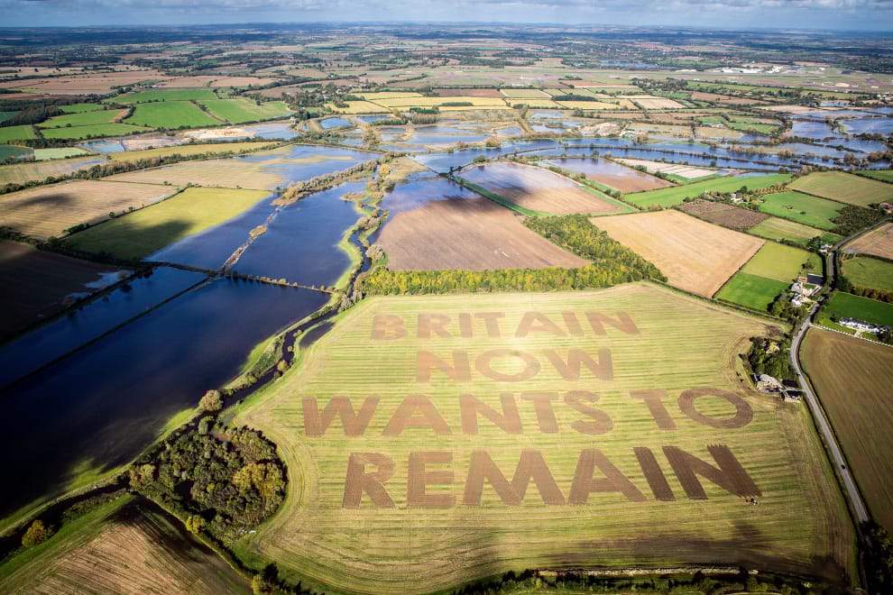 在西南部威爾特郡(Wiltshire)的斯文頓鎮(Swindon),英國反脫歐組織「由驢子領導」(Led By Donkeys)在農田上割出了「英國現在想要留下來」的字樣,強烈表達想要留歐的意願。