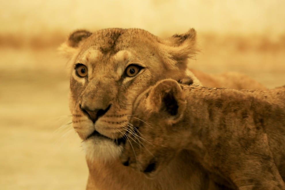 在白夏瓦(Peshawar)的一間動物園內,一隻小獅子用頭磨蹭著牠的母親。