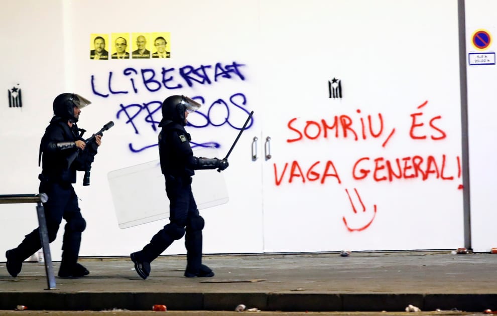 在加泰隆尼亞自治區的巴塞隆納街頭,鎮暴警察經過了貼有被判刑加獨政治人物海報的牆面,上頭的塗鴉寫到「釋放囚犯」、「笑一個吧!這不過是一場一般的罷工=)」。