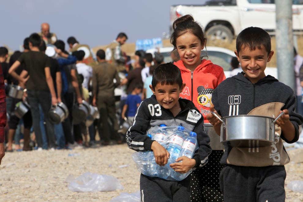 在接近敘利亞和土耳其邊界的巴爾達拉什(Bardarash)難民營內,逃離敘利亞戰亂的難民拿到了慈善組織的補給,他們的臉上終於露出開心的笑容。