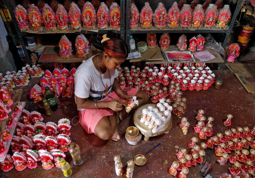 在加爾各答的一間工坊內,工作人員正在彩繪一尊尊象徵繁榮的象頭神(Ganesh)和吉祥天女(Lakshmi),準備迎接排燈節(Diwali)的到來。