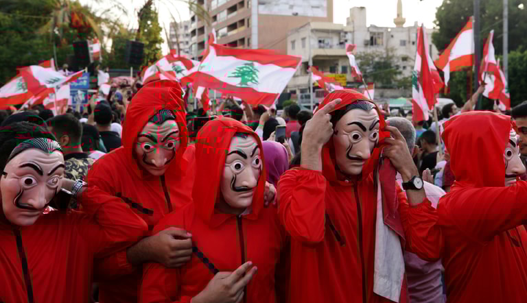 在位於地中海沿岸的賽達市(Sidon),抗議民眾戴上西班牙超現實大師達利(Salvador Dalí)的面具,上街要求政府下台。這頂面具曾出現在西班牙電視劇《紙房子》中,由反政府的銀行大盜所配戴,隨後也成了反政府的象徵。