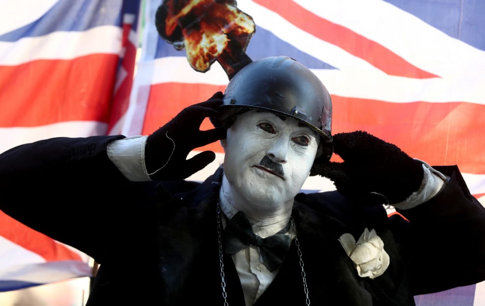 在倫敦國會大廈外,一名民眾打扮成英國喜劇演員卓別林(Charles Chaplin)的樣子反對脫歐。