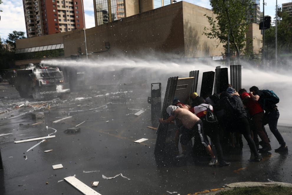 在首都聖地亞哥街頭,反政府示威民眾拿起盾牌,力抗鎮暴警察派出的強力水柱車。