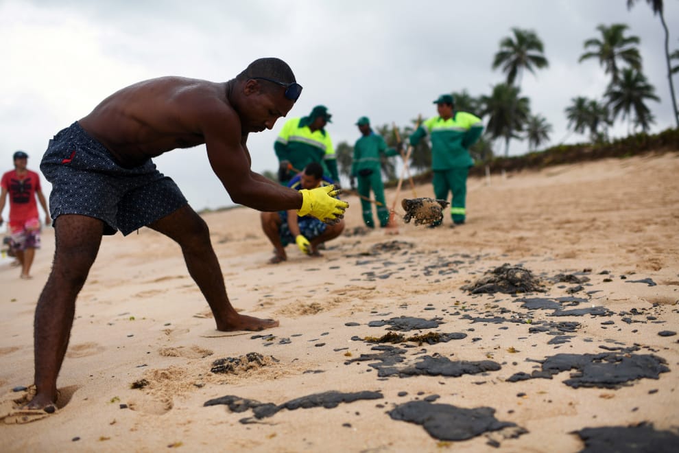在巴伊亞州(Bahia state)卡馬薩里市(Camacari)的Barra de Jacuipe海灘,人們正在清理沙灘上的漏油。從九月初開始,巴西綿延 2,200公里的美麗沙灘陸續遭到漏油汙染,然而,沒有人知道這些漏油來自何方,政府也沒有積極處理漏油汙染,不滿的民眾乾脆自己動手淨灘。
